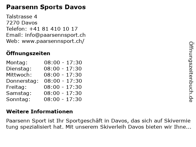 | Öffnungszeiten Paarsenn Sports Davos in Davos anzeigen | |