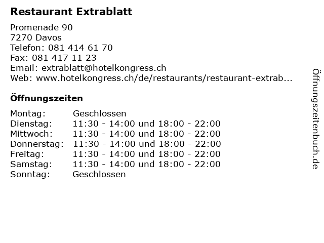 | Öffnungszeiten Restaurant Extrablatt in Davos anzeigen | |