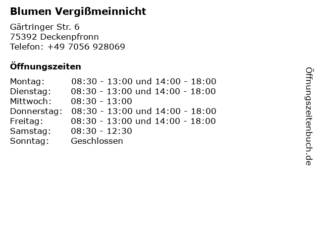 | Öffnungszeiten Blumen Vergißmeinnicht in Deckenpfronn anzeigen | |