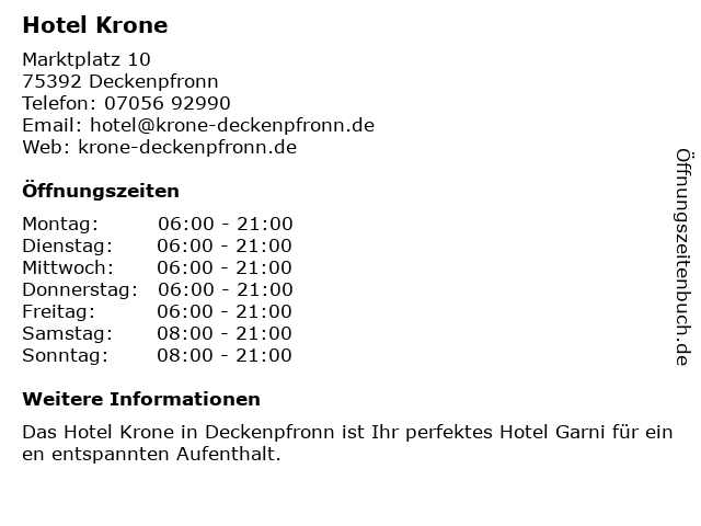 | Öffnungszeiten Hotel Krone in Deckenpfronn anzeigen | |