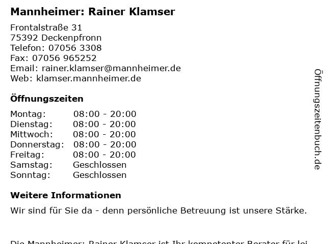 Branchen & Suchbegriffe zu Mannheimer: Rainer Klamser:klamser, mannheimer, rainer |