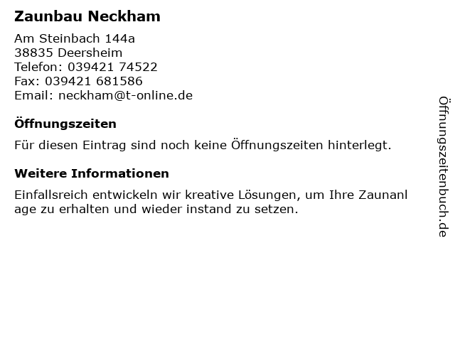 Öffnungszeiten Zaunbau Neckham in Deersheim anzeigen | |