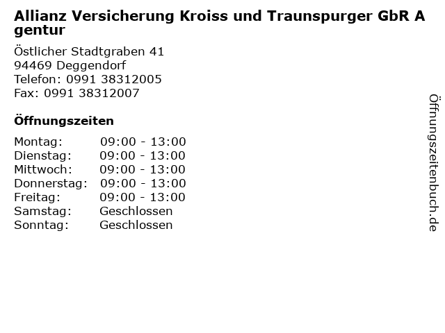1 Allianz Versicherung Gerhard Traunspurger Hauptvertretung (Entfernung: 0,00 km) Östlicher Stadtgraben 41, 94469 Deggendorf 2 Kinderwunschzentrum Dr. med. Hans-Joachim Kroiss (Entfernung: 1,47 km) Stadtfeldstr. 50, 94469 Deggendorf 6 |