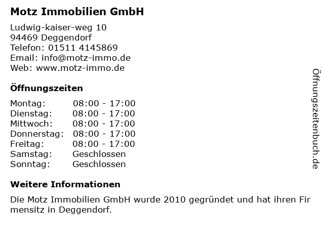 | Öffnungszeiten Motz Immobilien GmbH in Deggendorf anzeigen | |