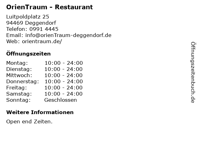| Öffnungszeiten OrienTraum - Restaurant in Deggendorf anzeigen | |
