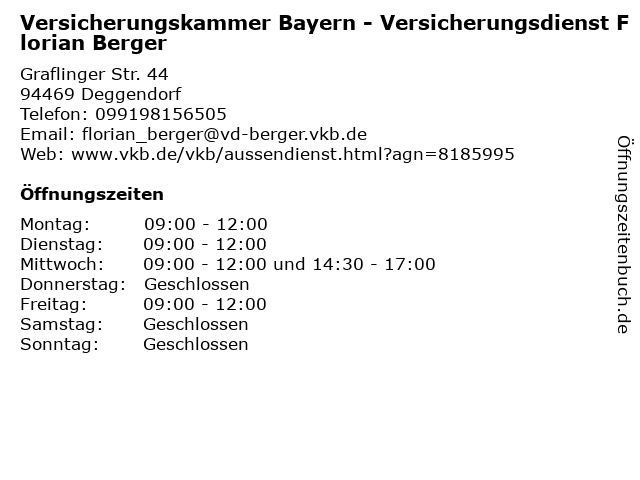 1 Versicherungskammer Bayern - Versicherungsagentur Florian Berger (Entfernung: 0,00 km) Graflinger Straße 44, 94469 Deggendorf 2 3 Versicherungskammer Bayern - Geschäftsstelle Deggendorf (Entfernung: 0,35 km) Amanstr. 13, 94469 Deggendorf 4 Versicherungskammer Bayern - Geschäftsstelle Deggendorf (Entfernung: 0,36 km) Amanstr. 13, 94469 Deggendorf 5 Versicherungskammer Bayern - Versicherungsbüro Jürgen Seebauer (Entfernung: 0,49 km) Graflinger Str. 1, 94469 Deggendorf 6 Versicherungskammer Bayern - Günther Wirkert Landwirtschaftlicher Betreuungsdienst (Entfernung: 0,74 km) Bahnhofstr. 13, 94469 Deggendorf |