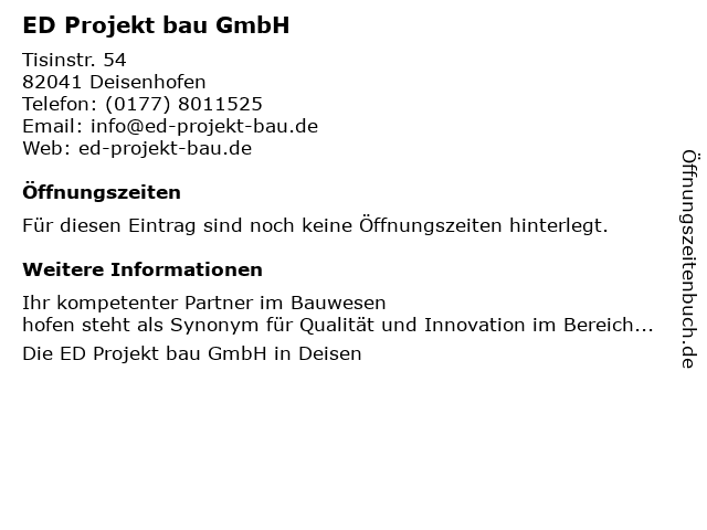 | Öffnungszeiten ED Projekt bau GmbH in Deisenhofen anzeigen | |