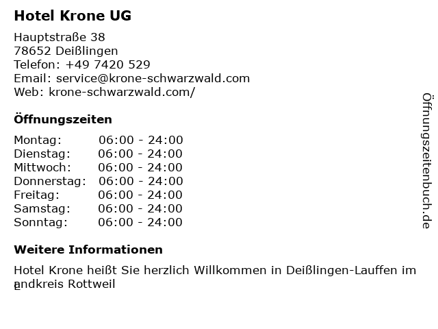 | Öffnungszeiten Hotel Krone UG in Deißlingen anzeigen | |