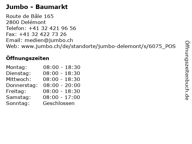 | Öffnungszeiten Jumbo - Baumarkt in Delémont anzeigen | |