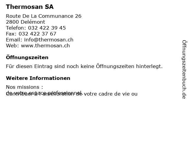 | Öffnungszeiten Thermosan SA in Delémont anzeigen | |