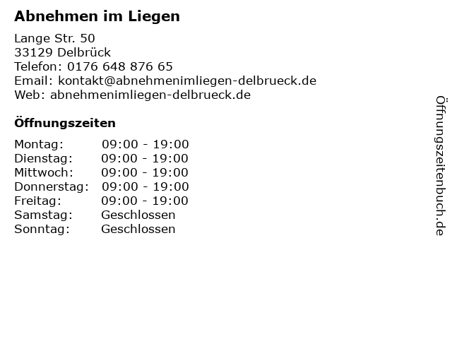 | Öffnungszeiten Abnehmen im Liegen in Delbrück anzeigen | |