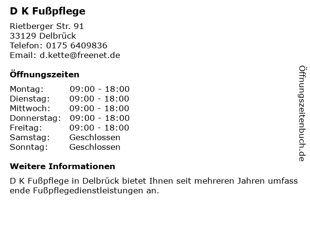 | Öffnungszeiten D K Fußpflege in Delbrück anzeigen | |