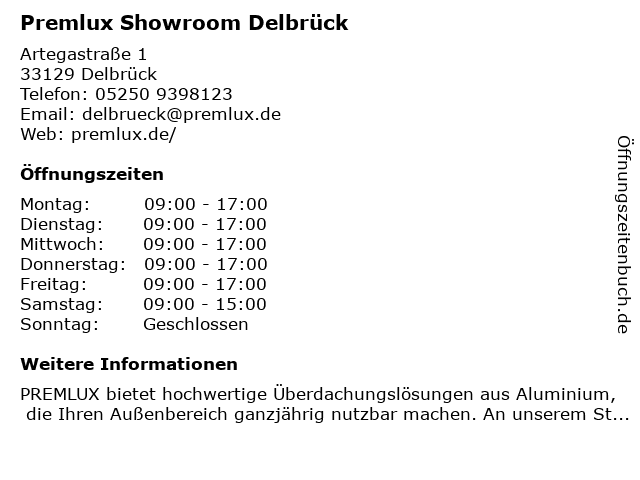 | Öffnungszeiten Premlux Showroom Delbrück in Delbrück anzeigen | |