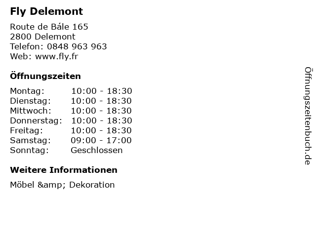 | Öffnungszeiten Fly Delemont in Delemont anzeigen | |