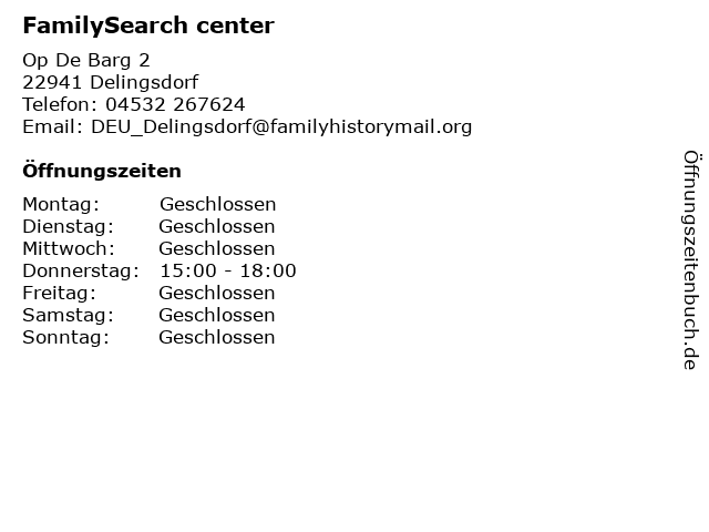 | Öffnungszeiten FamilySearch center in Delingsdorf anzeigen | |