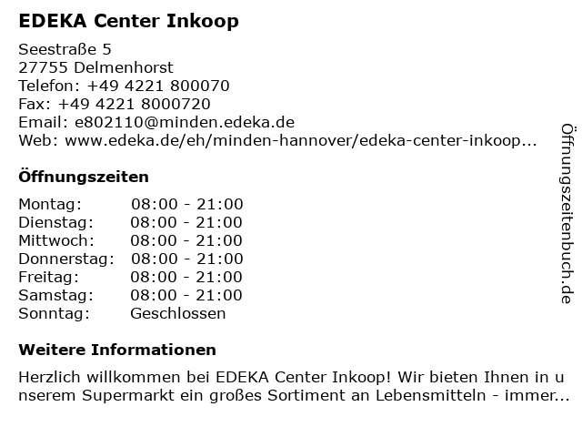 | Öffnungszeiten EDEKA Center Inkoop in Delmenhorst anzeigen | |