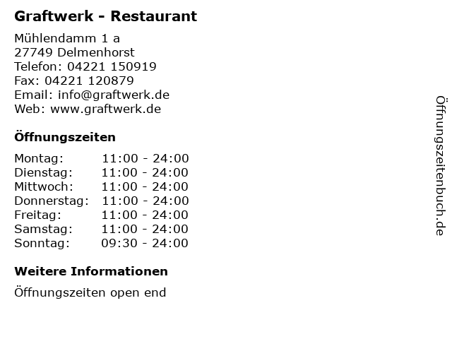 | Öffnungszeiten Graftwerk - Restaurant in Delmenhorst anzeigen | |