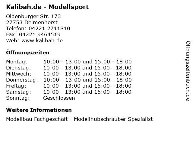 | Öffnungszeiten Kalibah.de - Modellsport in Delmenhorst anzeigen | |