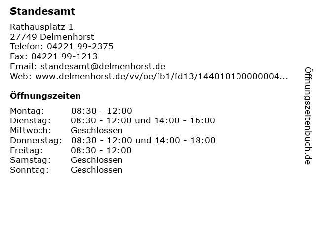| Öffnungszeiten Standesamt in Delmenhorst anzeigen | |