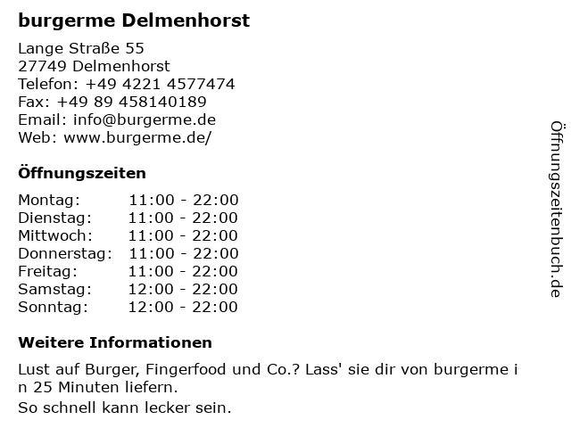 | Öffnungszeiten burgerme Delmenhorst in Delmenhorst anzeigen | |