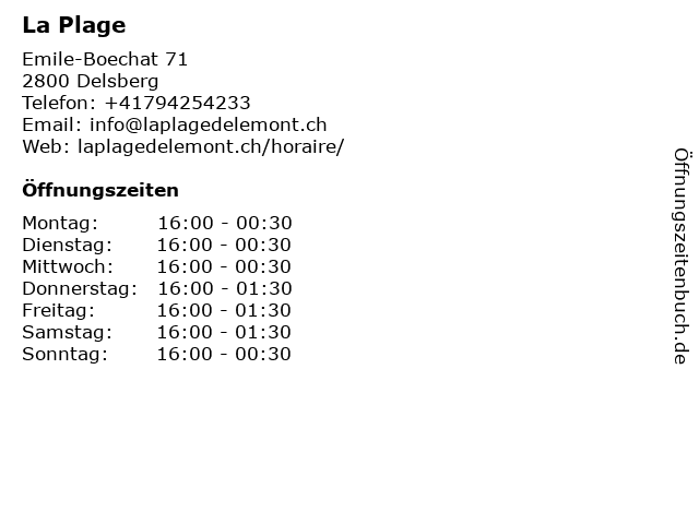 | Öffnungszeiten La Plage in Delsberg anzeigen | |