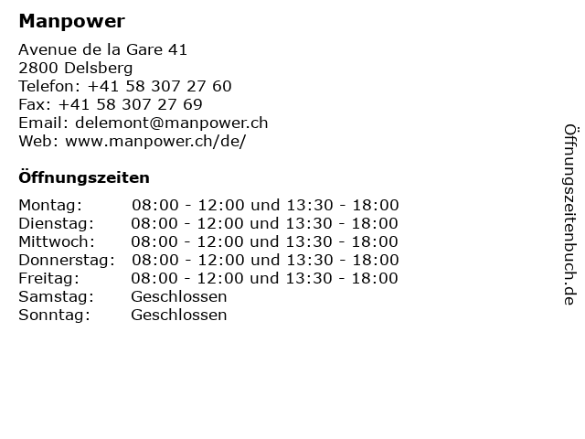 | Öffnungszeiten Manpower in Delsberg anzeigen | |