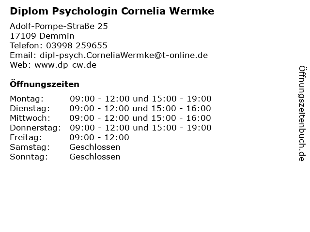 2 Sprungbrett Greifswald Begabungspsychologische Beratungsstelle (Entfernung: 30,60 km) Domstr. 39 A, 17489 Greifswald 4 Dipl.-Psych. Nadja Engel / Psychotherapie (Entfernung: 41,08 km) An der Marienkirche 4, 17033 Neubrandenburg 5 Diplom-Grafikdesigner Dieter Hoffmann (Entfernung: 54,58 km) Margaretenstraße 8, 18311 Ribnitz-Damgarten 6 Dr. med. Dirk Rösing - Praxis für Psychotherapie und Sexualmedizin (Entfernung: 0,20 km) Schillerstr. 9, 17109 Demmin |