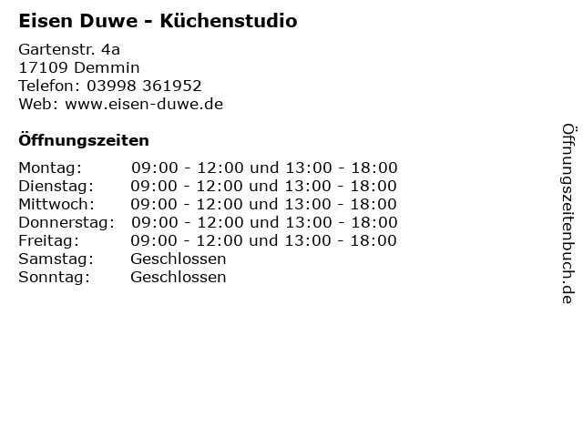 | Öffnungszeiten Eisen Duwe - Küchenstudio in Demmin anzeigen | |