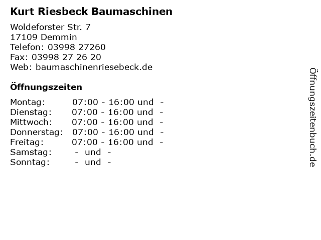 | Öffnungszeiten Kurt Riesbeck Baumaschinen in Demmin anzeigen | |