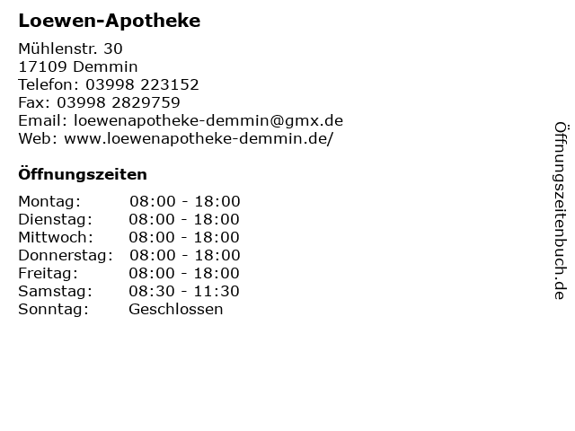 | Öffnungszeiten Loewen-Apotheke in Demmin anzeigen | |