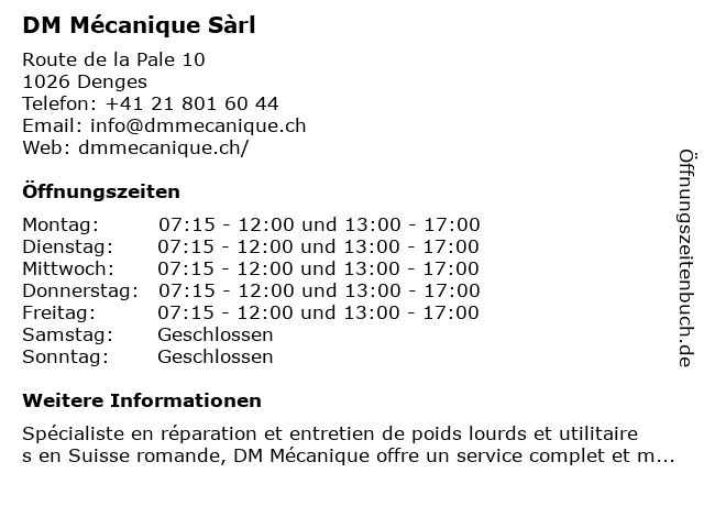 | Öffnungszeiten DM Mécanique Sàrl in Denges anzeigen | |