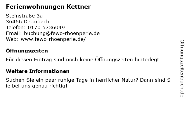| Öffnungszeiten Ferienwohnungen Kettner in Dermbach anzeigen | |