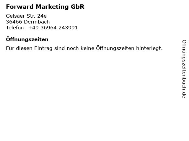 | Öffnungszeiten Forward Marketing GbR in Dermbach anzeigen | |