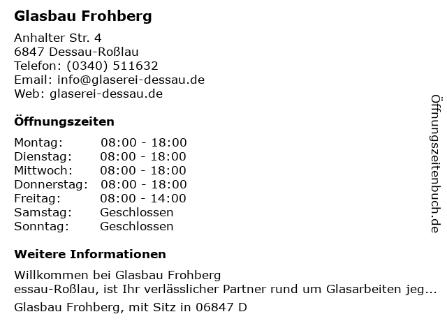 | Öffnungszeiten Glasbau Frohberg in Dessau-Roßlau anzeigen | |