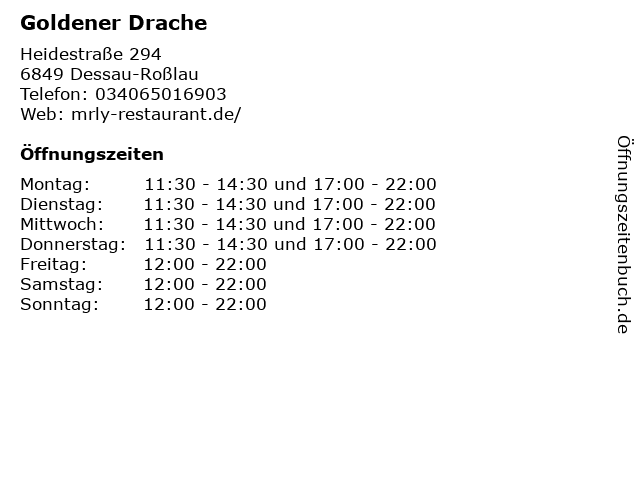 | Öffnungszeiten Goldener Drache in Dessau-Roßlau anzeigen | |