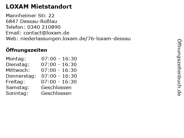 | Öffnungszeiten LOXAM Mietstandort in Dessau-Roßlau anzeigen | |
