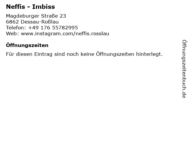 | Öffnungszeiten Neffis - Imbiss in Dessau-Roßlau anzeigen | |