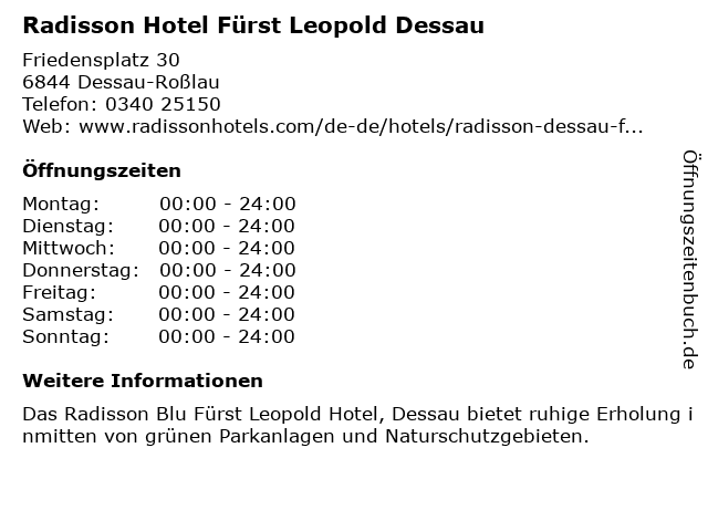 1 Radisson Blu Fürst Leopold Hotel | Restaurant Fürst Leopold (Entfernung: 0,02 km) Friedensplatz 1, 06844 Dessau 2 Radisson Blu Fürst Leopold Hotel | Sonnenterrasse (Entfernung: 0,02 km) Friedensplatz 1, 06844 Dessau 5 Reiseland American Express Reisebüro im Fürst-Leopold-Carré (Entfernung: 0,06 km) Antoinettenstr. 37, 06844 Dessau-Roßlau 6 Radisson Blu Fürst Leopold Hotel, Dessau - 06844 Dessau (Entfernung: 12,71 km) Friedensplatz 12, 06786 Wörlitz |