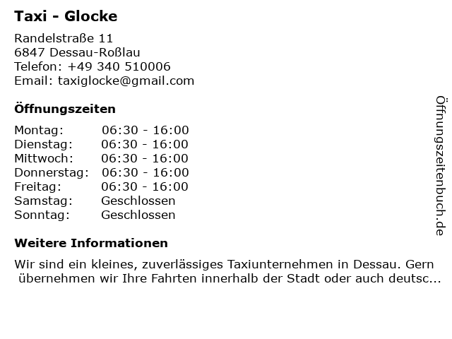 | Öffnungszeiten Taxi - Glocke in Dessau-Roßlau anzeigen | |