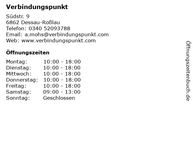 | Öffnungszeiten Verbindungspunkt in Dessau-Roßlau anzeigen | |