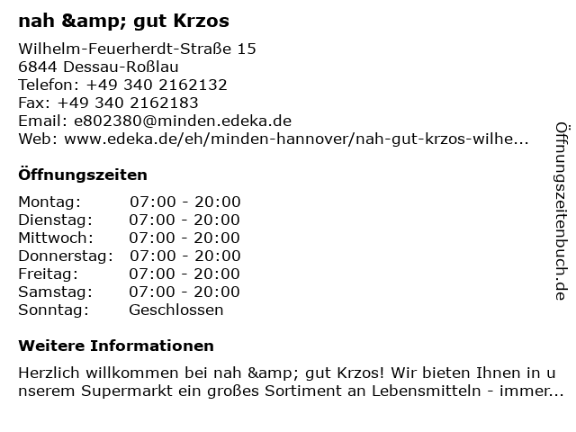 | Telefonnummer nah & gut Krzos in Dessau-Roßlau (+49 340 2162132) anrufen | |
