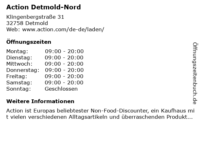 | Öffnungszeiten Action Detmold-Nord in Detmold anzeigen | |