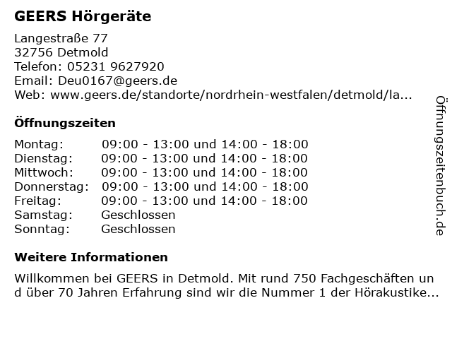 | Öffnungszeiten GEERS Hörgeräte in Detmold anzeigen | |
