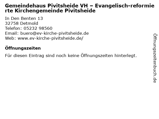 | Gemeindehaus Pivitsheide VH – Evangelisch-reformierte Kirchengemeinde Pivitsheide anrufen | |