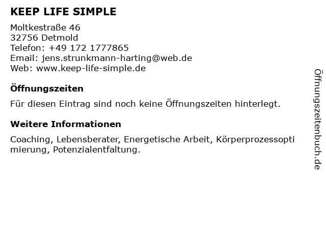 | Öffnungszeiten KEEP LIFE SIMPLE in Detmold anzeigen | |