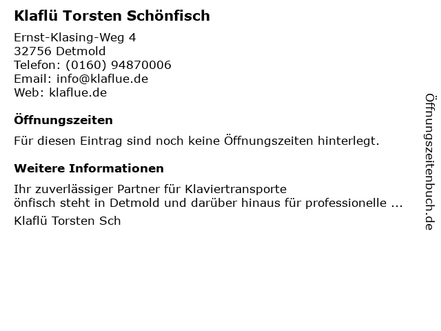 | Öffnungszeiten Klaflü Torsten Schönfisch in Detmold anzeigen | |