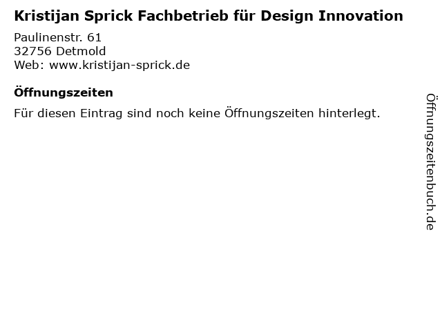 | Öffnungszeiten Kristijan Sprick Fachbetrieb für Design Innovation in Detmold anzeigen | |