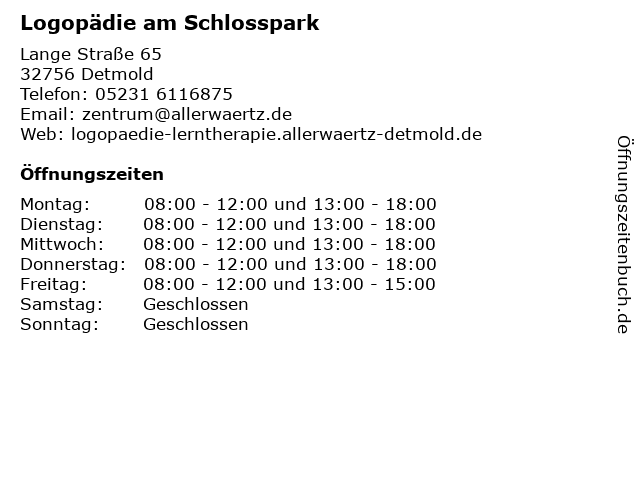 | Öffnungszeiten Logopädie am Schlosspark in Detmold anzeigen | |