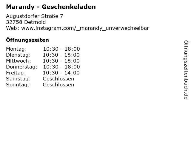 | Öffnungszeiten Marandy - Geschenkeladen in Detmold anzeigen | |