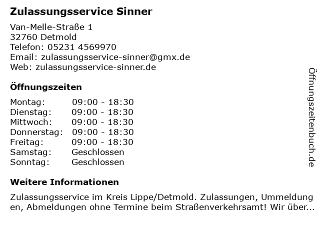 | Öffnungszeiten Zulassungsservice Sinner in Detmold anzeigen | |